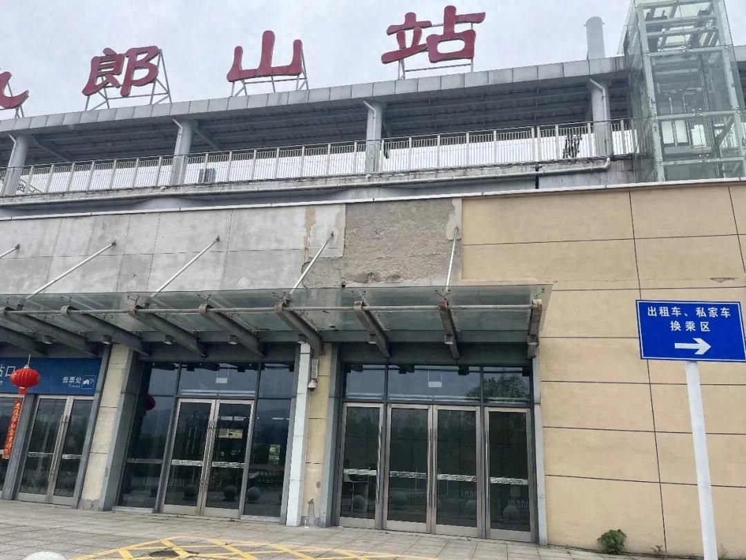 九郎山站建筑外立面已有墙体脱落。图/受访者供图