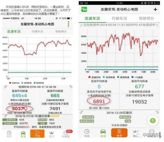 以上是两辆没到首保的新车。用友趣安驾APP测试,正常新车抖动一般在200以内,而这辆车,高达五六千以上。