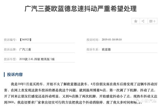 “我是18年1月底买的车,开始不太了解欧蓝德这款车,4月份朋友座在我车后排发现了这辆车抖动厉害,在网上查发现这款车投诉的都是我这个问题,就到温州博菱4s店,第一次调了下机脚,抖动了点,开了回来让朋友们感觉还是抖动明显,又到4s店换了两次机脚,开始感觉抖动小了点,现热车抖动又达到2800。我迫切要求厂家拿出切实可行的方法把我这个抖动消除掉,废了我太多时间和精力。”