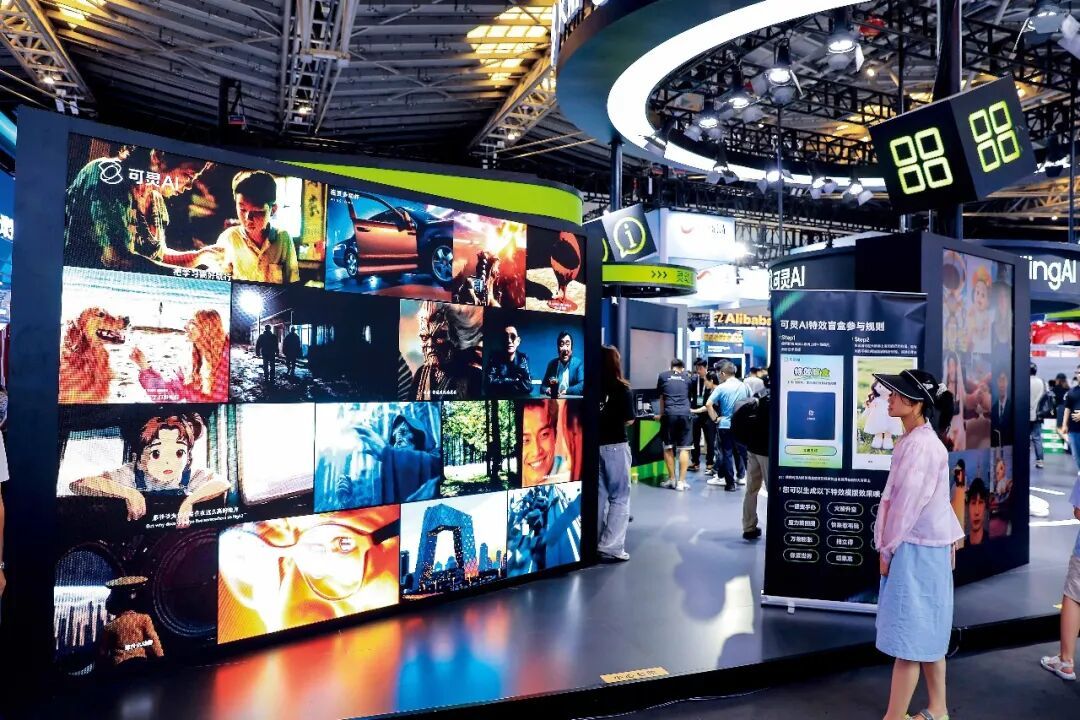 下图:2025年7月29日,2025世界人工智能大会上的可灵AI文生图、文生视频展区。图/IC
