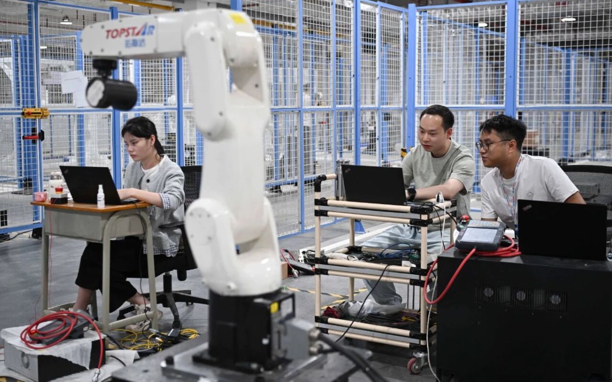 3月25日,在东莞的广东拓斯达大岭山生产基地,工作人员在测试工业机器人产品。图/新华
