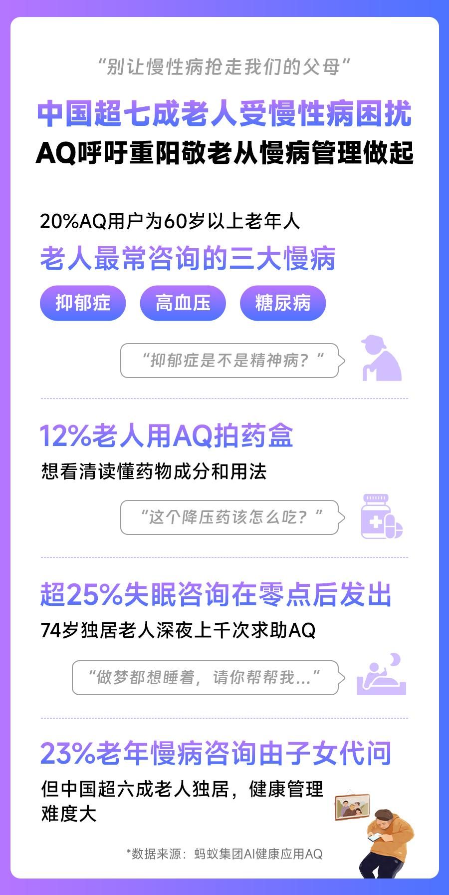 10月27日,蚂蚁集团AI健康应用AQ发起重阳节倡议《别让慢性病抢走我们的父母》,呼吁全社会将敬老爱老延伸至老年慢病管理这一健康问题,并推出AI拍血压血糖、家人健康风险预警、慢病用药定时提醒等5项产品新功能,帮助子女将说不出口的担心,变成真切的关心。