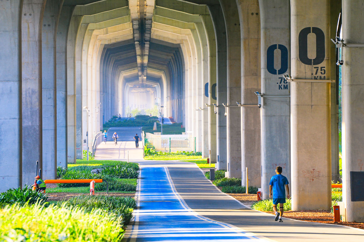 在“赛时服务赛事,赛后服务民生”理念下,宝安区各项体育设施实现“赛后就近”惠民。图为沿江高速高架下碧道。(宝安区委宣传部供图)