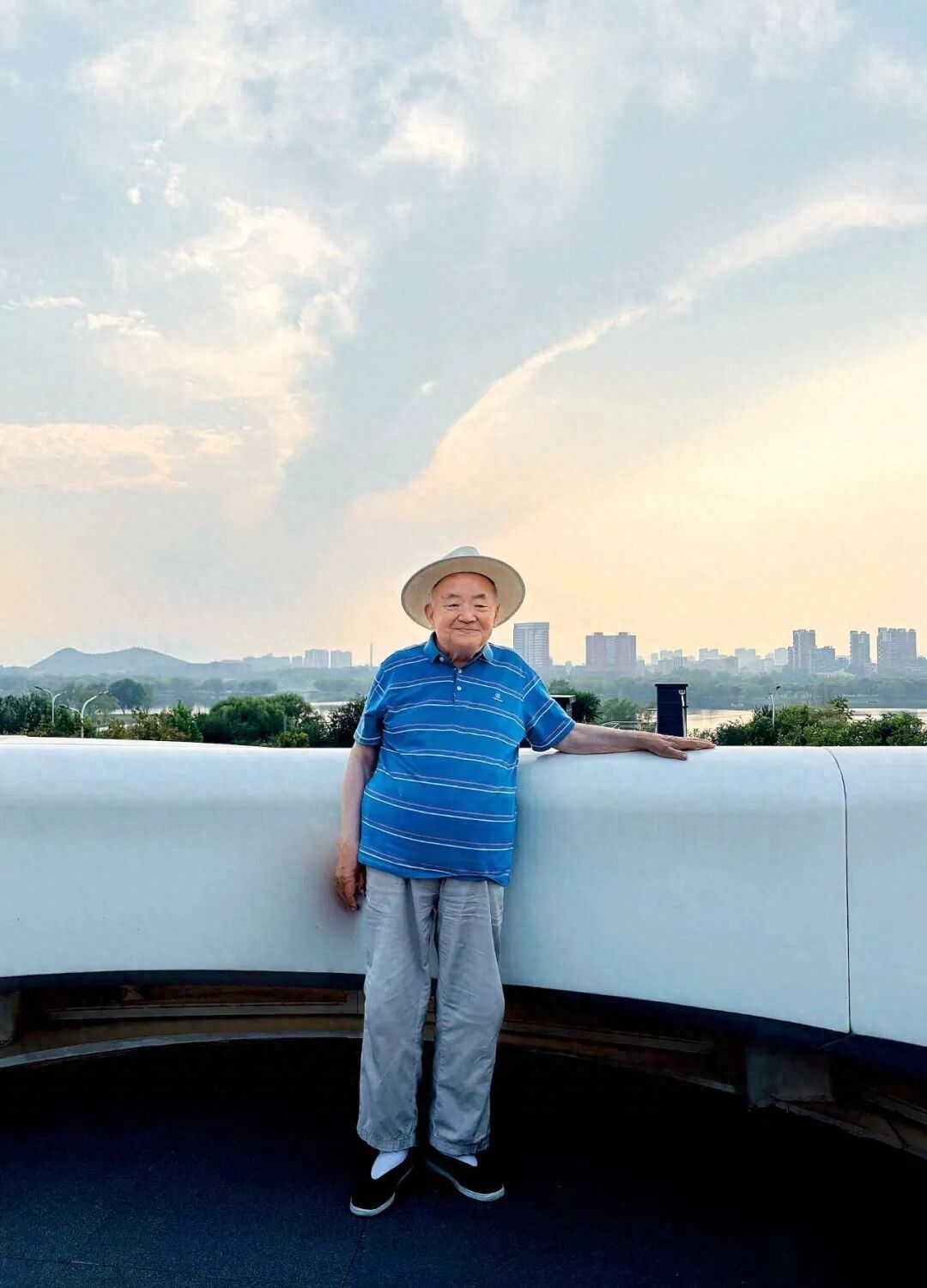 钱理群步下轮椅,在泰康燕园观景台前留影。他说,自己现在是沉浸在周遭世界之中,又出入于天地之间。摄影/黄卫