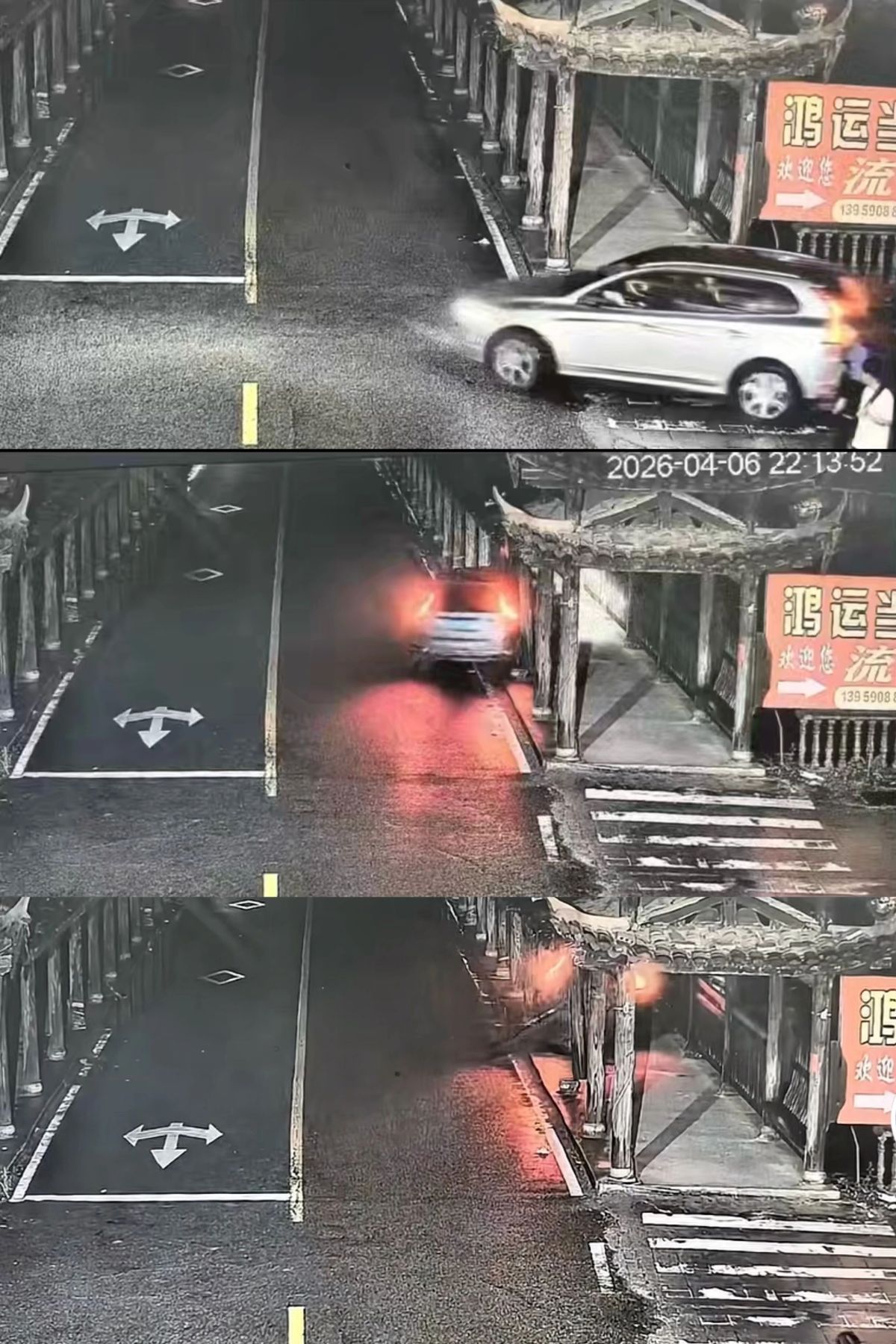 网络上流传的一段现场监控视频显示,4月6日晚上10点13分许,一辆SUV以较慢的速度行驶到桥上,突然车身向右冲向廊桥,撞毁了廊柱,又冲破围栏,坠入河中。旁边还有行人急忙冲上前。