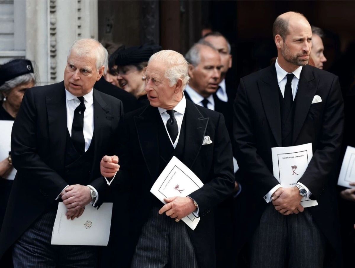 9月16日,英国国王查尔斯三世(中)、安德鲁王子(左)、威廉王子(右)在伦敦出席弥撒仪式。图/视觉中国