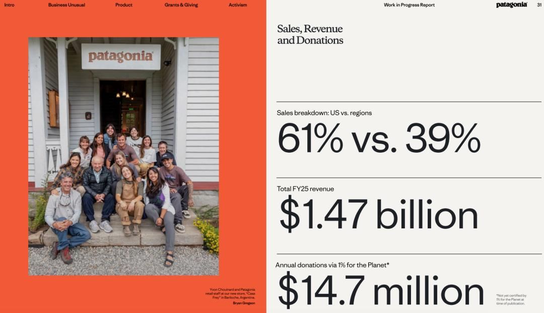 在截至2025年4月30日的完整财年里,Patagonia实现销售额14.7亿美元(人民币约101亿元),其中61%来自美国市场,39%来自国际市场。捐出1470万美元(人民币约1亿元),用于支持全球环保活动人士和草根组织。