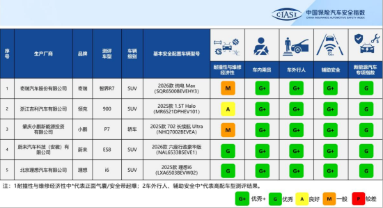 测评结果显示,耐撞性与维修经济性分指数,2款车型获得优秀(G),1款车型获得良好(A),2款车型获得一般(M)。结构耐撞性得分方面获得优秀评价的车型1款(蔚来ES8);碰撞兼容性方面获得优秀评价的车型3款(奇瑞智界R7、蔚来ES8、理想i6)。5款车型在低速主动安全方面均获得加分,并均获得优秀评价。