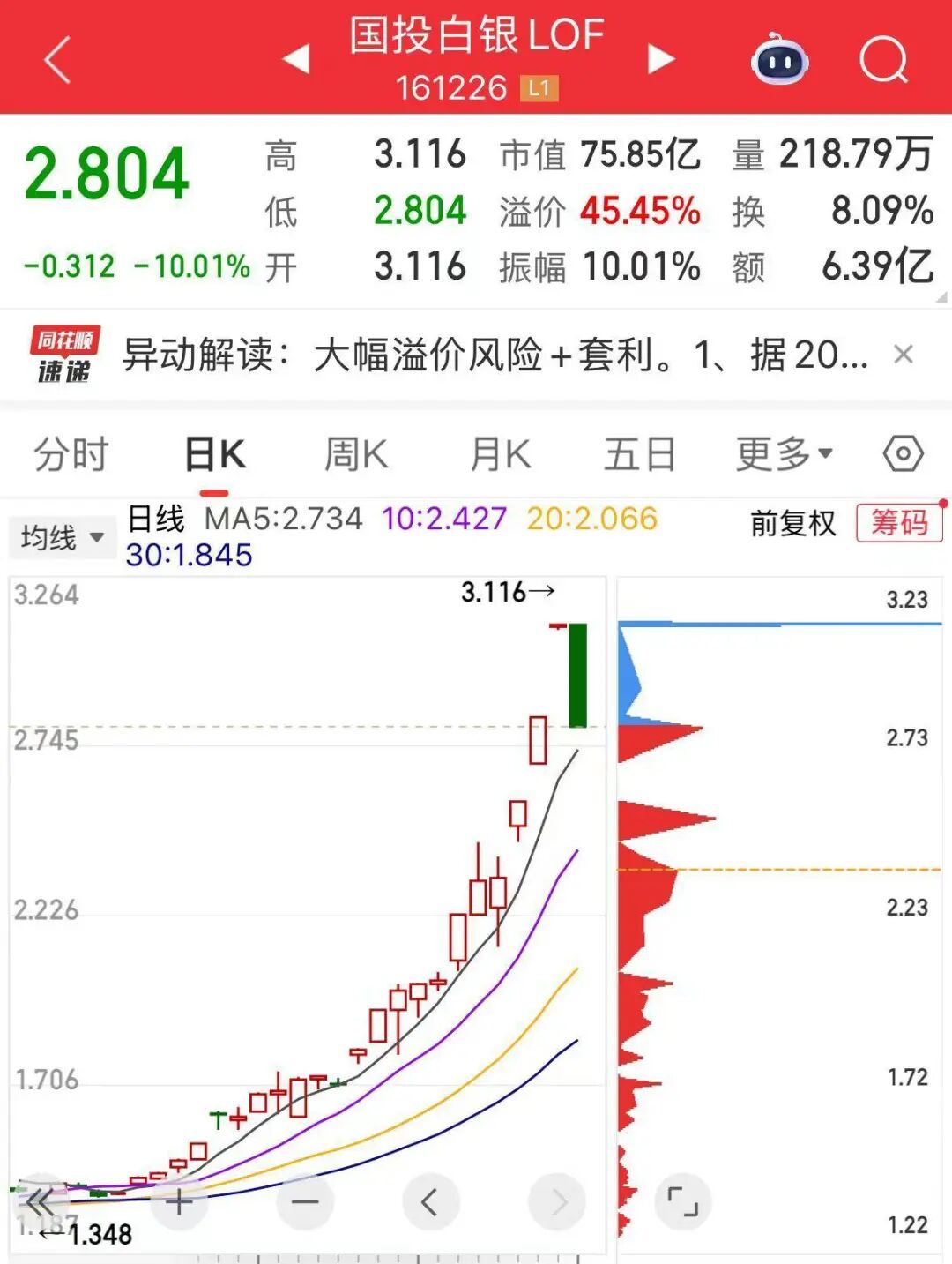 一方面,国投白银LOF是全市场唯一一只主要投资于白银期货的基金产品。这意味着近期白银趋势性行情吸引大量资金涌入,只能集中在该基金,进而推高场内价格。