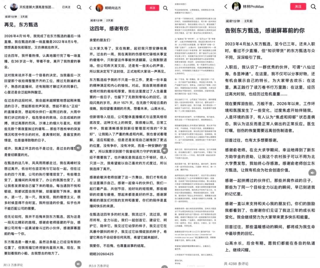 天权提到在过去四个月里“公司的执行管理层变了,有些理念变了,直播间的风格变了,办公的氛围也变了”;明明则直言“清晰感受到管理层对我的‘不友好’”;中灿也说起“公司发生很多变化”,“我真的尽力了”;2023年加入东方甄选的林林更是透露,2026年以来工作和环境的变化,令自己处在焦虑和抑郁之中……