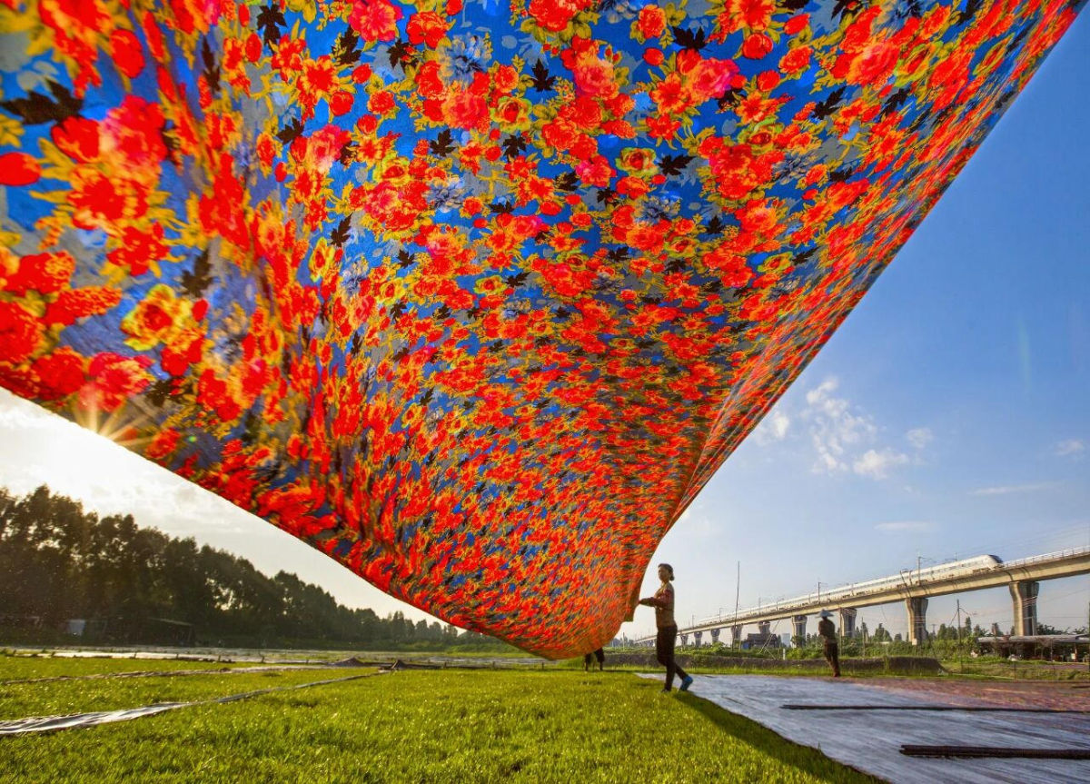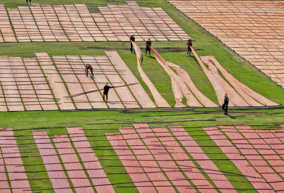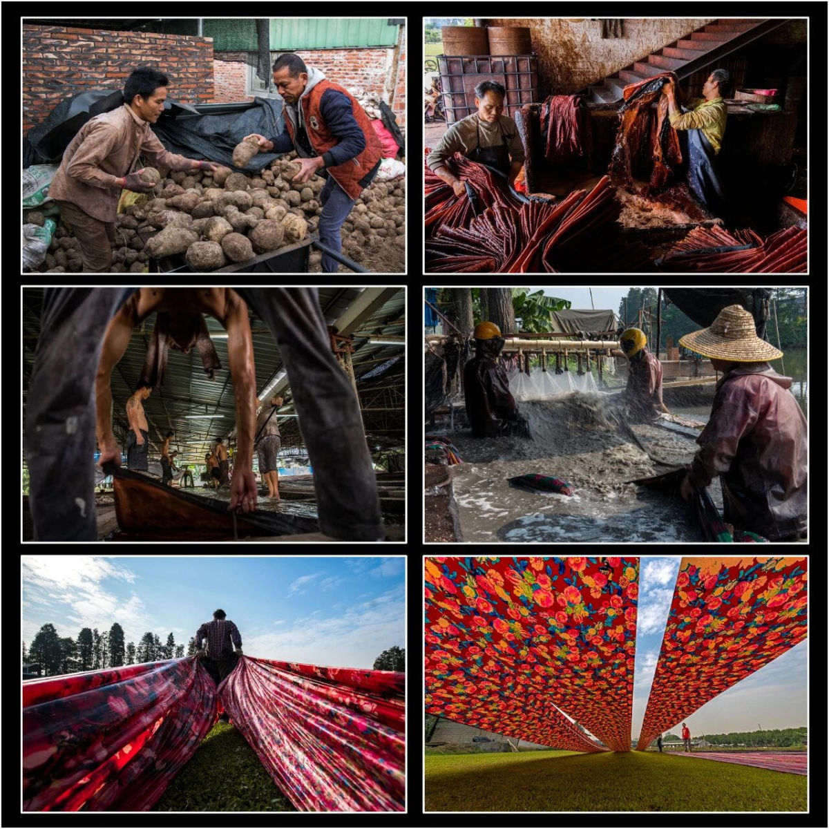 位于顺德伦教,工人们正在晾晒香云纱纱布。李志强摄