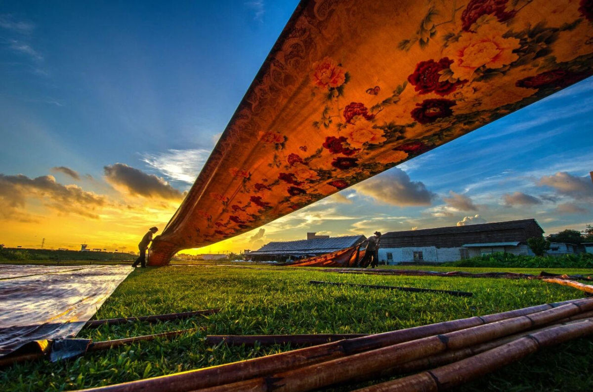 “香云纱认天、认地、认人。”在顺德伦教晒莨场,工作了二十多年的老师傅直起身,指着初升的太阳说。他脚边,褐红色的丝绸正在晨光中舒展身姿。