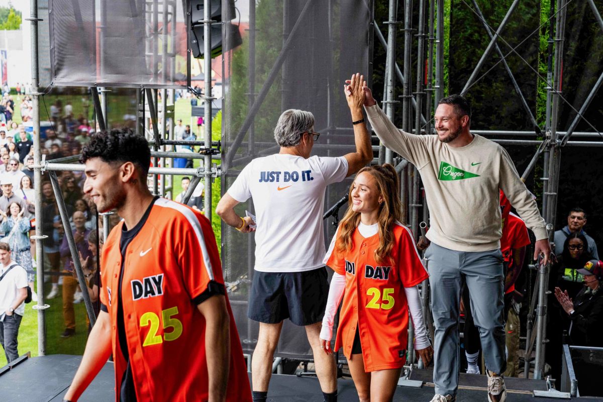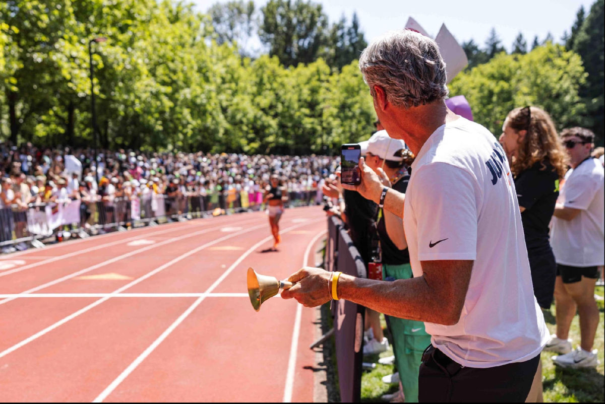 在六月的“Just Do It员工日”期间,贺雁峰为“Nike Mile”比赛的最后一圈摇动铃铛。这项比赛是他重新发起的内部跑步赛事,旨在表彰速度最快的员工。