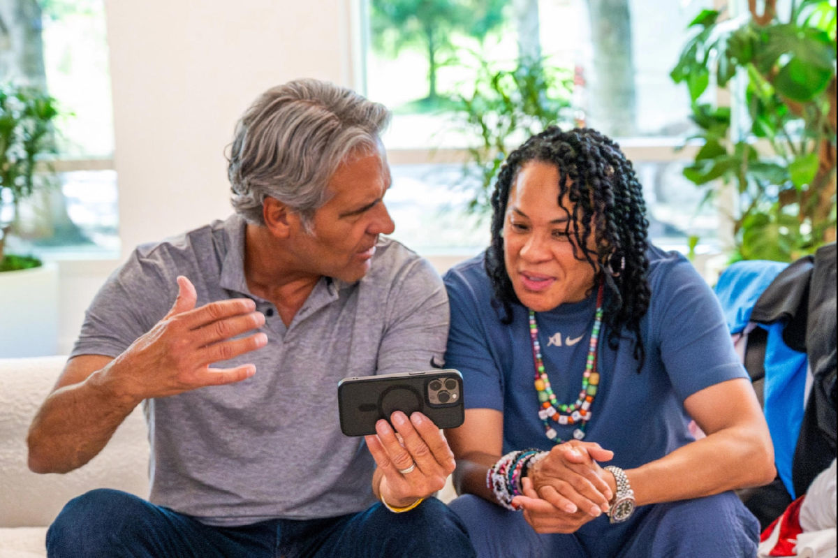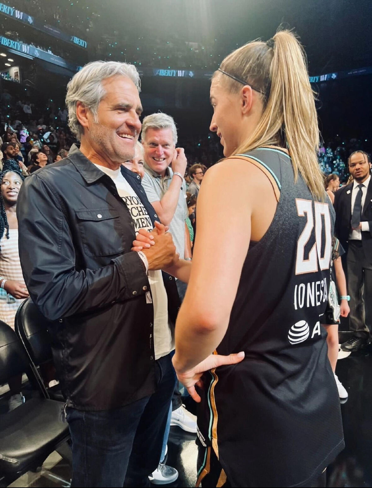 无需多言,他的行动就是最好的证明。他拿起工作手机(别和桌上那支外壳一模一样的私人手机混淆了),打开与纽约自由人队球员萨布丽娜·约内斯库(Sabrina Ionescu)的短信对话。(就在当天早上,一位“史上最伟大”级别运动员联系他时,用的是那部私人手机。)两人的聊天记录很长,一滑就是好几屏。他们会互相发送照片,比赛结束后贺雁峰也会问候她的近况。聊天内容大多围绕这位WNBA球星今年早些时候发布的签名鞋——“Sabrina 3”展开。他点开一张5月17日的照片,那天正是自由人队对阵拉斯维加斯王牌队的赛季揭幕战。照片中是贺雁峰与妻子吉娜(Gina)、约内斯库(Sabrina Ionescu)、北美区总经理兼副总裁汤姆・佩迪(Tom Peddie)及其妻子莎伦(Sharon),他们将脚并拢成圈,展示脚上的耐克鞋。“我非常认可贺雁峰的处事方式,”约内斯库表示,“每次我向他分享对我事业发展至关重要的想法时,他总会让我感受到自己的声音真的被听到。他懂得如何与人建立真诚的情感联结,我很庆幸他能回到耐克大家庭。”