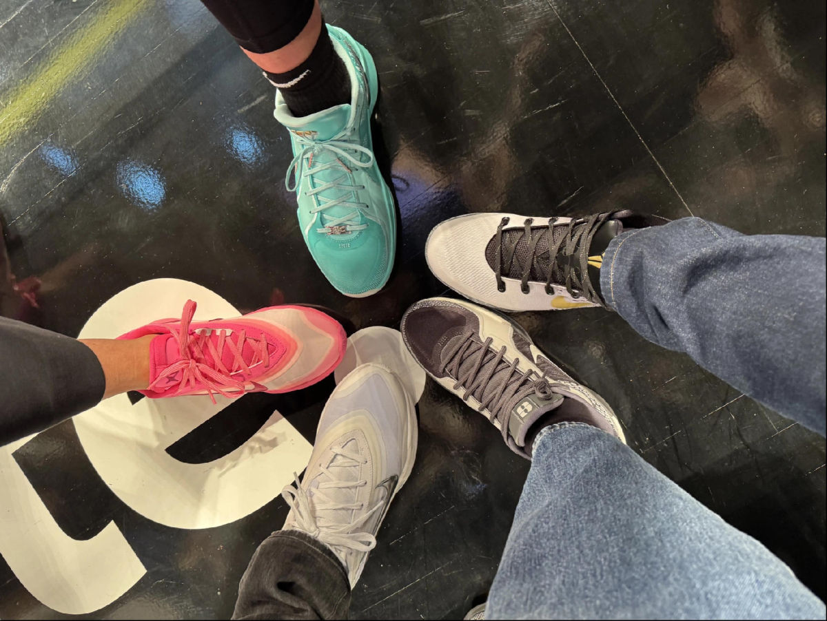 从上方开始顺时针方向依次是:萨布丽娜·约内斯库(Sabrina Ionescu)穿着青绿色Sabrina 3,贺雁峰穿着Kobe 7,吉娜·希尔(Gina Hill)穿着黑白配色Sabrina 3,汤姆·佩迪(Tom Peddie)穿着白色A'One,莎伦·佩迪(Sharon Peddie)穿着粉色A‘ja One。