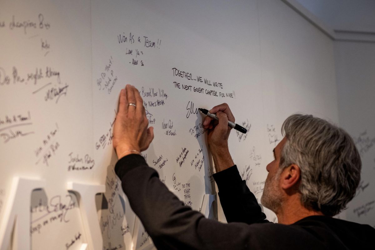在耐克全球总部的史蒂夫·普里方丹大楼,贺雁峰在Nike Maxims信条墙上写下:“齐心协力,我们将书写耐克的下一个伟大篇章。”