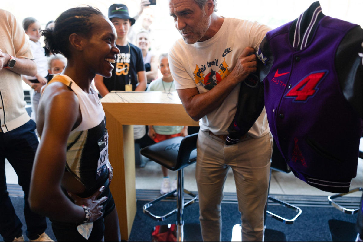 贺雁峰向世界冠军跑者基普耶贡(Faith Kipyegon)赠送了一件定制的Nike Breaking 4夹克。在耐克的支持下,基普耶贡于今年6月向女子“一英里跑进4分钟”的纪录发起挑战。