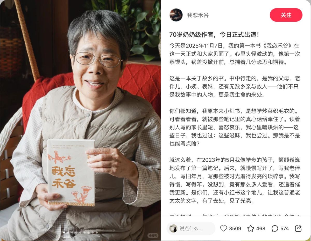 大赛挖掘出不少“小红书养成系作家”。大赛“岁月纪实奖”得主70岁奶奶王玉珍最近刚出版了她的第一本书,书名《我恋禾谷》便取自她的小红书网名。玉珍介绍自己“无文学慧根,无文字功底”,但她写的身边人被作家梁晓声称为“真正的人世间”。