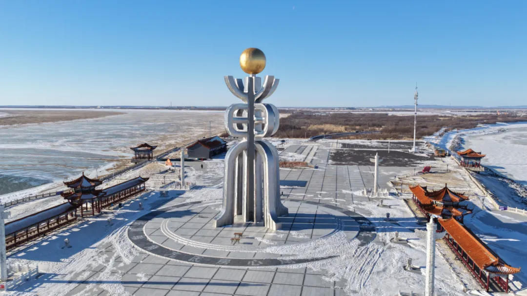 冰雪覆盖的黑瞎子岛上,一座高约40米的巨大“东”字雕塑矗立在东极广场。