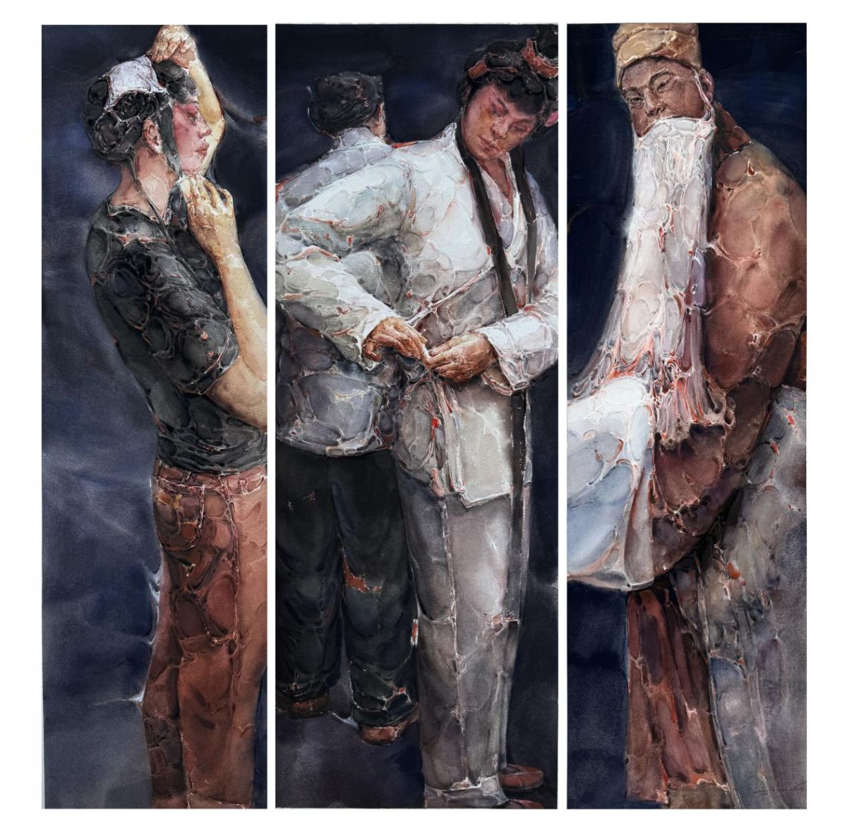 郎丽巍运用湿润的笔法捕捉昆曲演员后台的经典瞬间:胭脂未匀的侧脸、悬停的发簪、凝固的时光,水彩的流动性在此幻化为无形的唱腔。“我从油画‘跨界’而来,相信来自不同画种的元素都能成为创作的养分。这次展出的作品分为人物画和风景画两类,专门选取展出了戏曲人物系列和江南园林系列画作。”参展艺术家郎丽巍说。