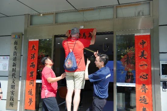 美国青年学生在深圳市南山区前海社区过春节,图为美国教师贴“春联”。(南山教育局供图)