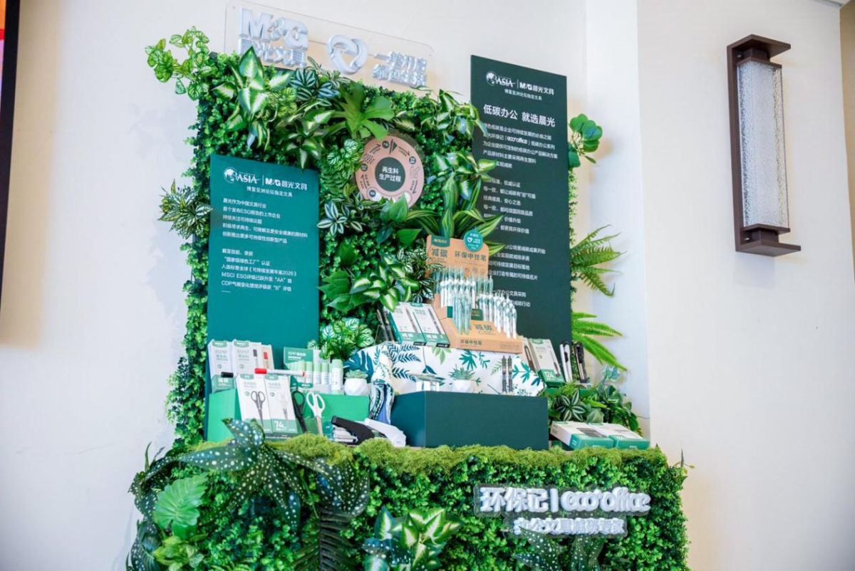 在论坛设立的可持续专区,与会嘉宾可近距离体验晨光低碳办公产品,感受绿色办公的品质与设计,而为论坛嘉宾提供的定制文具套装中,亦有同系列的中性笔。