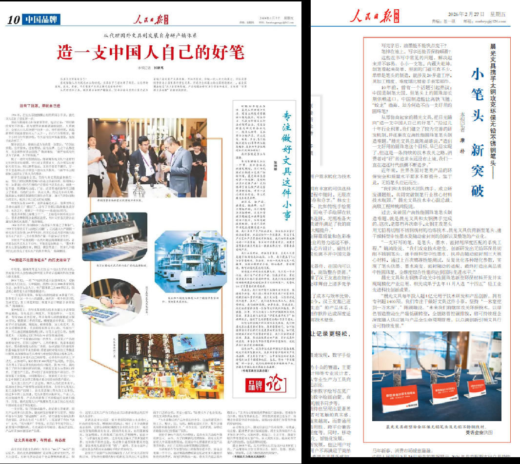 深耕行业30多年,晨光秉持“一米宽挖到一万米深”的专注,攻克笔头油墨核心技术,打磨生产工艺,坚持做中国人自己的好笔。从攻克笔头国产化难题,到制笔新型环保材料的突破,再到规模化产业应用,国家队成员晨光两度被人民日报专题点赞,代表了中国制笔人几十年如一日的匠心。