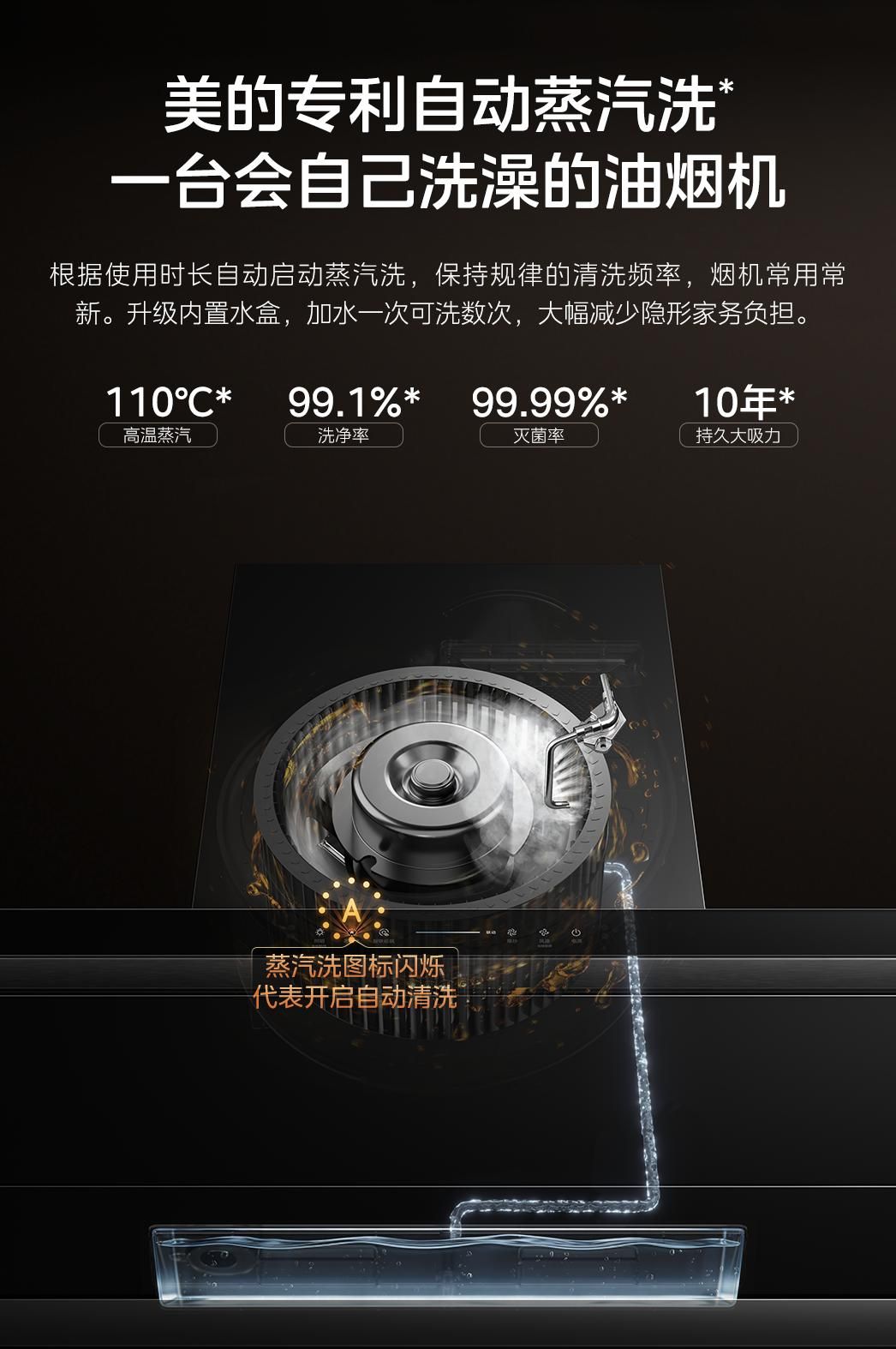 不同于传统油烟机搭载的自清洁功能,美的小西梅油烟机_x0005_模拟深度清洁的黄金法则:先将清洁用水加热成110℃高温蒸汽,蒸汽经由350千帕高压作用喷射而出,内部进行360°无死角冲刷。高温+高压可深度溶解顽固油渍,实现了99.1%的油污洗净率与99.99%的杀菌率,从根源上杜绝了油污堆积对电机和风道的影响。内置专利BMC塑封电机技术,更能通过水电永久分离,来提升用户使用时的安全性。