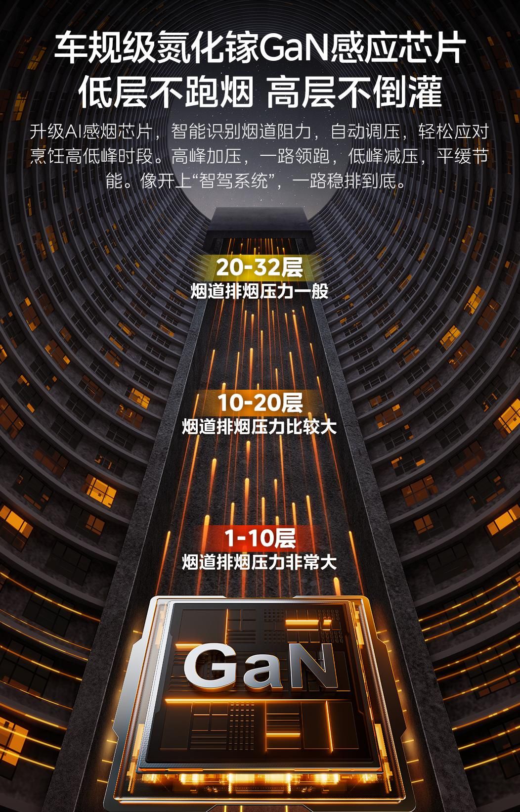 在排烟高峰时段自动加压,可确保油烟一路领跑顺畅排出;在低峰时段则平稳运行,节能降噪。“跑车级动力总成”GaN材料的应用,能让电机在0.9秒极速响应启动,运行更平稳、更安静,动力更强,有效杜绝油烟倒灌,从容应对各种复杂排烟环境。