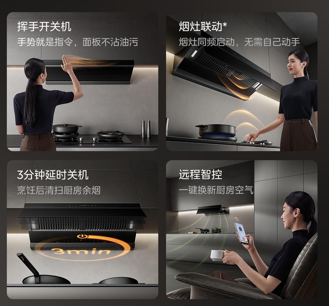 挥手智控功能,可让用户在感应区前轻轻挥手即可实现开关、调档,彻底解放双手。更进一步,其烟灶联动功能(需搭配美的智能灶具)实现了更高阶的自动化:灶具点火,烟机自动开启;关火后,烟机智能延时关闭,吸净余味。从空间到操控,小西梅致力于让烹饪过程更自在、更从容。通过美的美居APP,用户还能实现远程操控、定时关机、一键空气焕新等扩展功能。