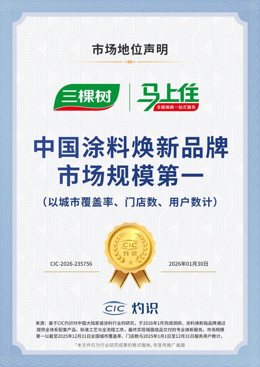 以产业之力践行民生担当,以品牌之责引领行业前行。“中国涂料焕新品牌市场规模第一”,不仅是三棵树“马上住”站上新起点,更标志着中国涂料焕新行业步入高质量发展的新征程。面向未来,三棵树“马上住”持续深化“1+N”生态战略,聚力产品研发与服务升级,与全国经销商伙伴同频共振,融入国家“好房子”建设大局,以更健康、更美丽、更美好的居住环境,回应亿万家庭对美好生活的向往,为产业转型升级与民生福祉提升贡献更多力量。