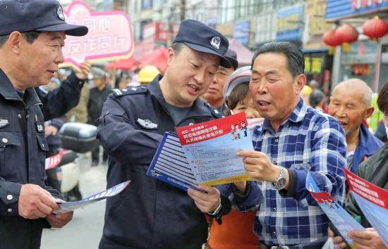 派出所民警在传统集市上向群众宣传防诈骗知识。中新社发 周强摄