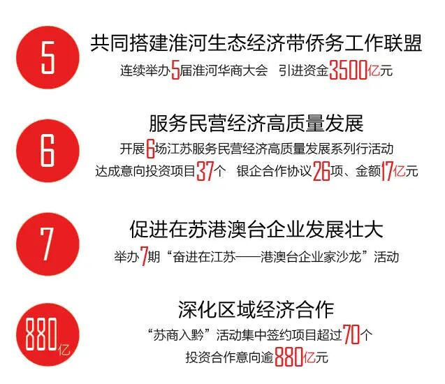 发挥统战优势促发展。举办3届江苏发展大会,来自海内外、省内外的嘉宾汇聚一堂,叙情谊、谋发展、话未来。仅第三届江苏发展大会期间就签约项目132个,投资总额超过4800亿元,为推进江苏高质量发展注入强劲动能。举办7期“奋进在江苏——港澳台企业家沙龙”活动,有力促进在苏的港澳台企业发展壮大。在深化区域经济合作方面,“苏商入黔”活动集中签约项目超过70个,投资合作意向逾880亿元。联合淮河沿线5个省份28个市县侨办,共同搭建淮河生态经济带侨务工作联盟,连续举办5届淮河华商大会,引进资金3500亿元。