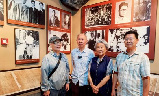 2025年10月,陆诒之子陆良年、范长江之子范小军、周恩来侄女周秉德和金仲华之孙金进在八路军桂林办事处纪念馆的国新社展览前合影。摄影/蒋雪林