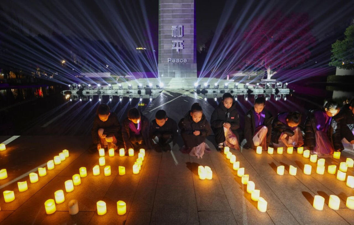 12月13日是南京大屠杀死难者国家公祭日。当晚,“烛光祭·国际和平集会”在侵华日军南京大屠杀遇难同胞纪念馆举行,南京大屠杀历史记忆传承人、国际友人后代、紫金草志愿者、青少年代表等共同缅怀逝者,祈愿和平。图为“烛光祭·国际和平集会”现场。中新社记者 泱波 摄