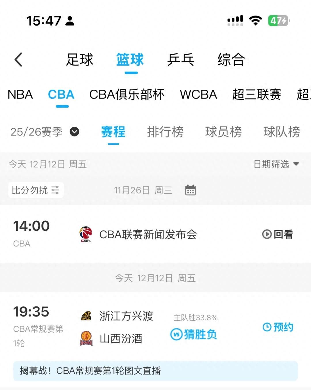 12月12日下午,咪咕平台仍显示CBA揭幕战为图文直播 图/咪咕视频