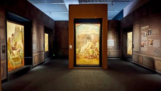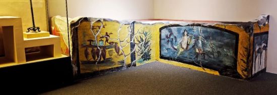 展览临近入口处,展示了四面巨大的庞贝壁画,均有一人多高,展厅内还有多幅小型壁画。大型壁画多为神话传说题材,其中两幅均为酒神主题。正中的《马尔斯和维纳斯》,则描绘了战神马尔斯与爱神维纳斯的爱情场景。四面巨大壁画陈列于同一个深邃的空间中,模拟了最初的室内陈设环境,观众可以近距离观看画中细节。