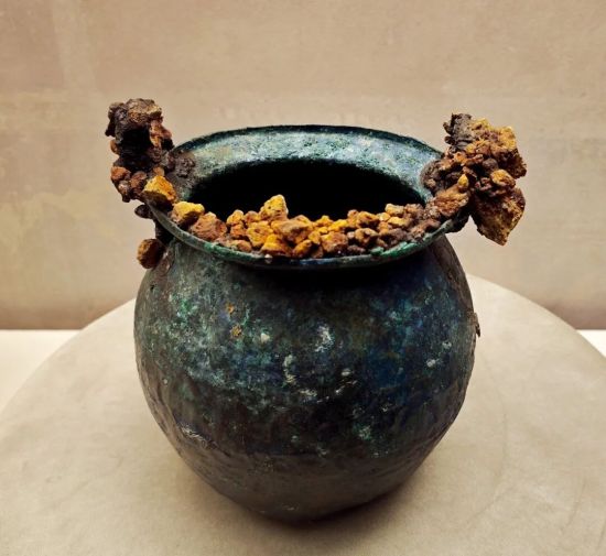 “热食店”一侧的展柜里,一件绿色青铜桶最初就掉落在店里的地上,似乎是被火山爆发的热浪掀翻在地。最引人注意的是,桶口堆着半圈凹凸不平的浮石,那是火山喷发造成的堆积,堆积物甚至已经将桶口的提梁熔化。