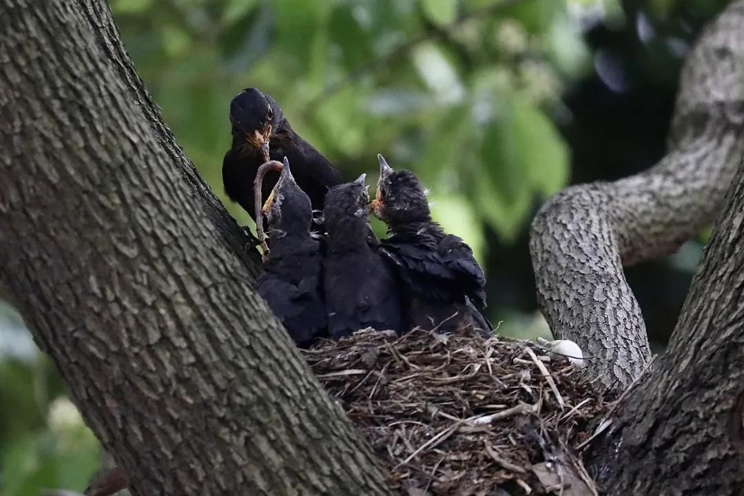 乌鸫在养育雏鸟 图/中新社记者泱波 摄