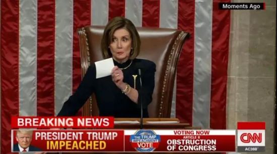 美国众议院议长佩洛西宣读最后的投票结果。(CNN视频截图)