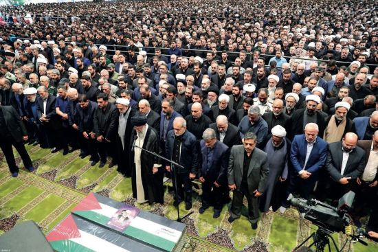8月1日,伊朗德黑兰,伊朗最高领袖哈梅内伊在送葬队伍中,带领人们在哈尼亚及其保镖的灵柩前祈祷。图/视觉中国