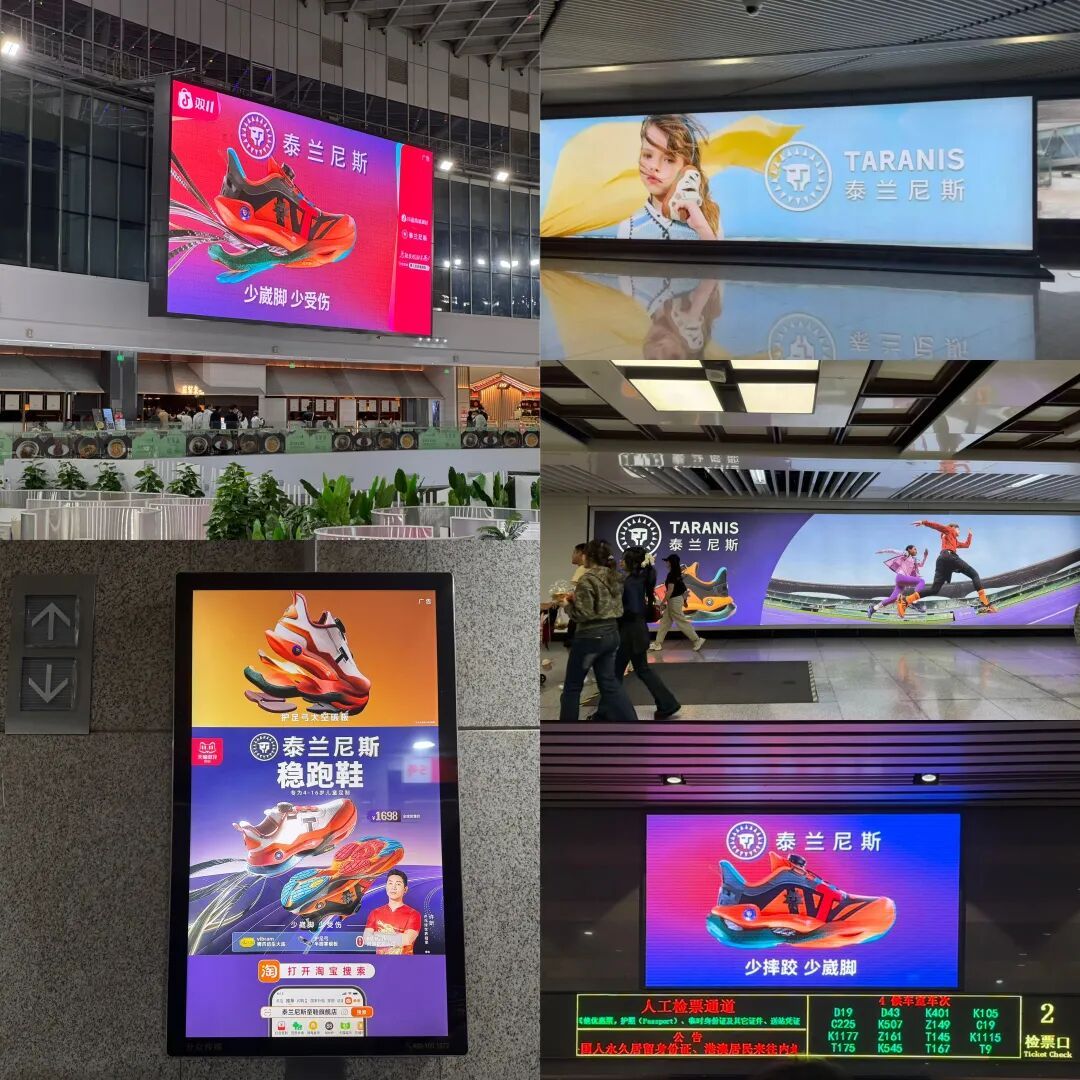 2022年起,泰兰尼斯押上未来 3—4 年利润投放分众广告,通过饱和式广告投放,强化品牌记忆。2023年8月,推出“稳稳鞋”系列,也通过分众的渠道,在机场、高铁站、电影院等中产家长高频出现的场景全面覆盖广告。