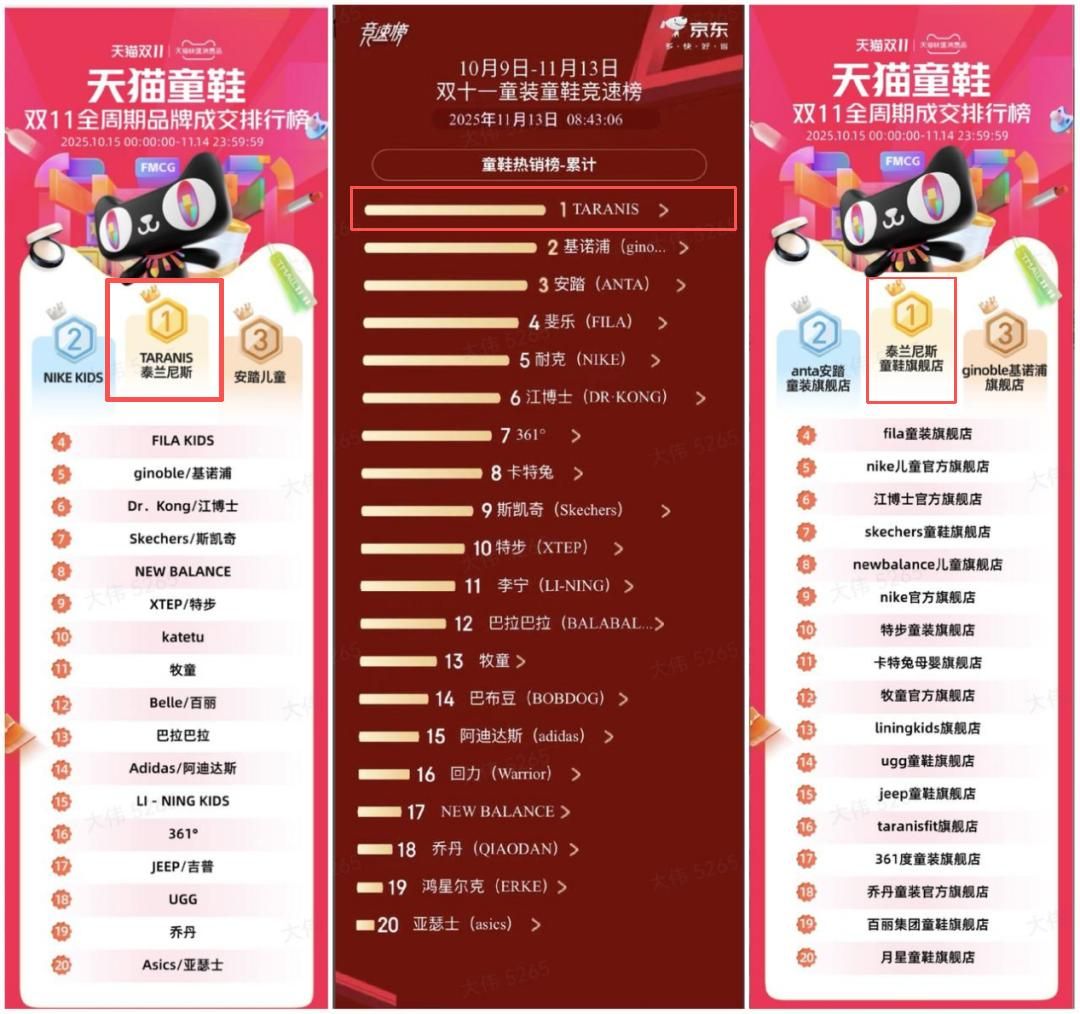 在2024年“双11”期间,泰兰尼斯刚和NIKE、安踏一起跻身童鞋销量的Top3;到2025年“双11”,泰兰尼斯更是在各个平台均冲到第一,干掉了NIKE KIDS、安踏儿童、FILA KIDS 等一众大牌。