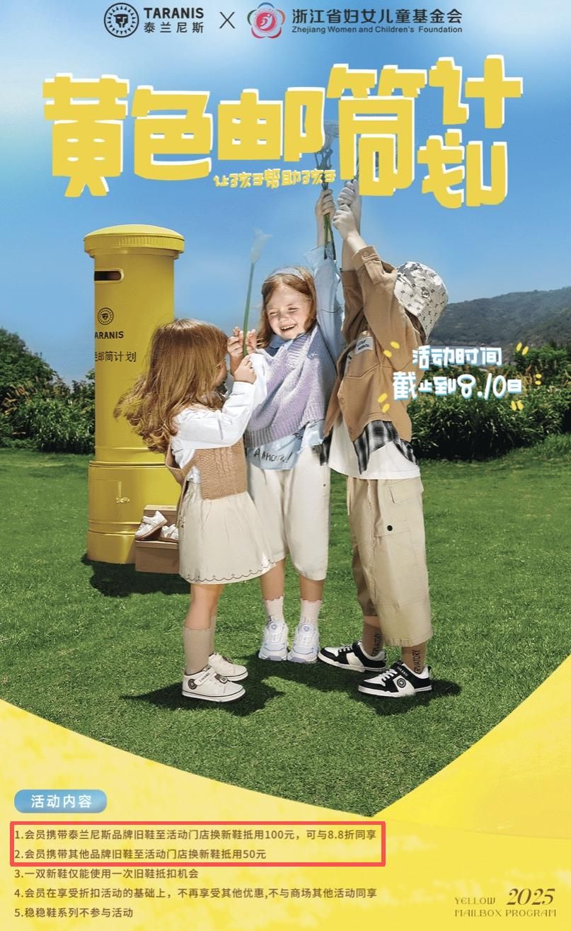 于是它发起了一个“黄色邮筒计划”:用户可以面向山区儿童捐赠旧鞋,每捐赠一双泰兰尼斯旧鞋,可以获得100元的“以旧换新”优惠券,其他品牌旧鞋也能参与,但只能抵50元。