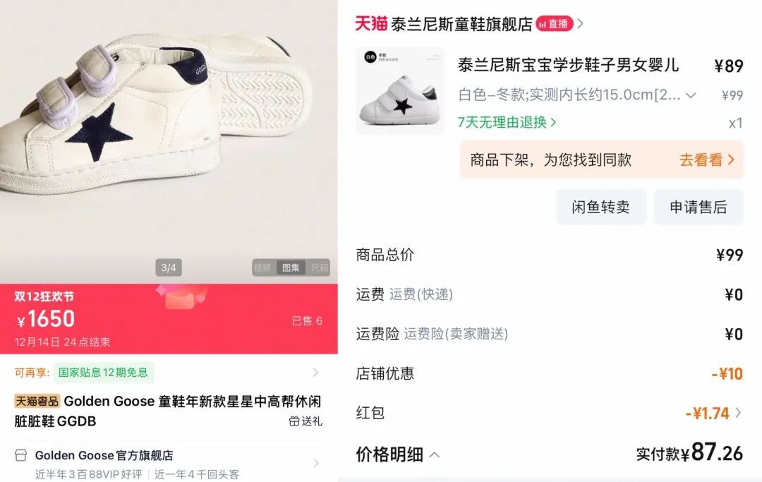 值得注意的是,即使是外观专利更多,泰兰尼斯的产品设计仍被网友指出不少款式是模仿大牌鞋的设计。例如,泰兰尼斯一款99元的宝宝学步鞋和意大利品牌Golden Goose一款1650元的脏脏鞋样式如出一辙;泰兰尼斯389元的一款宝宝加绒低帮靴与日本mikihouse一款1653元的棉鞋样式雷同。