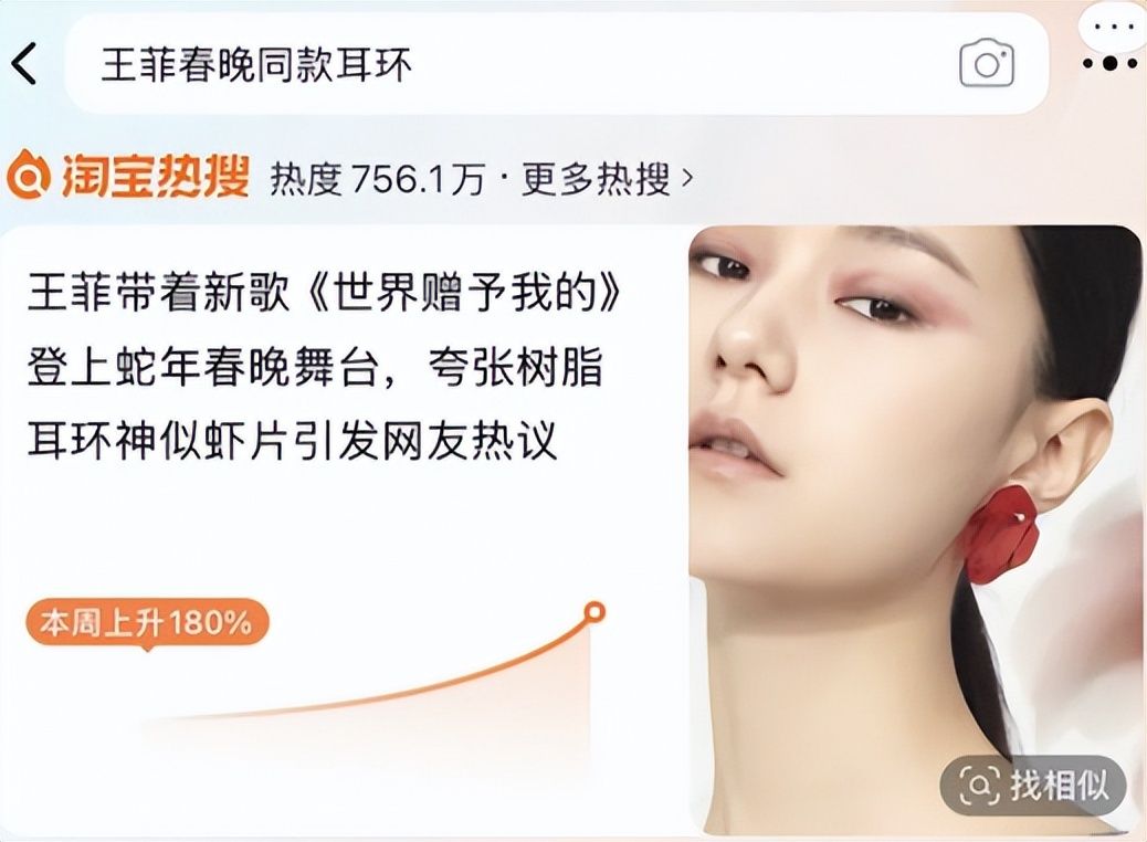 据时尚买手Vivian介绍,王菲首次在春晚佩戴的那款“虾片耳饰”,是Monies品牌35年前的款式。由于买不到相同的货,消费者纷纷转向平替,在2025年春晚后,形似虾片的粉色耳饰在淘宝一周内搜索量上升了180%。