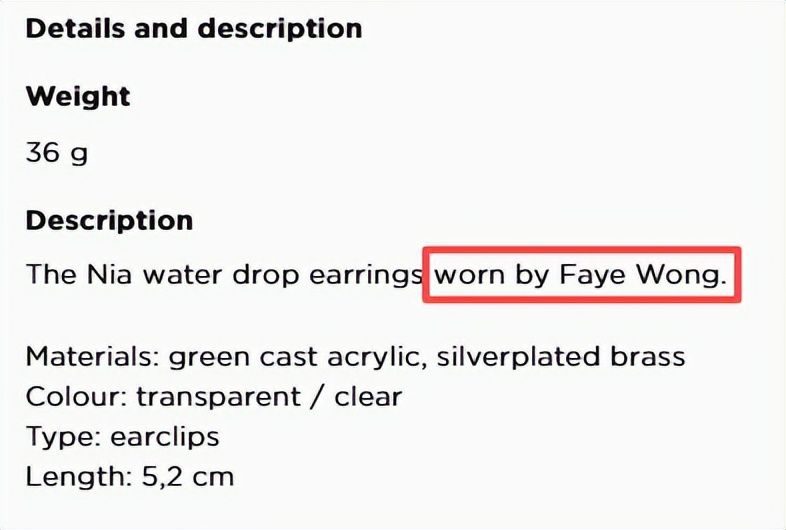 而今年“水滴耳饰”爆火后,品牌似乎做好了准备。有趣的是,品牌在发现耳饰爆火后,火速改简介,在该款耳环的简介中加上了“王菲同款”的字样。目前,该款耳饰在其官网已显示售罄。